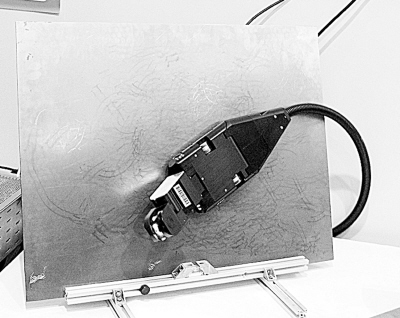 在展臺上,記者看到一個(gè)像壁虎一樣吸附在鐵板上爬行的機(jī)器,不禁問道:它能干什么?